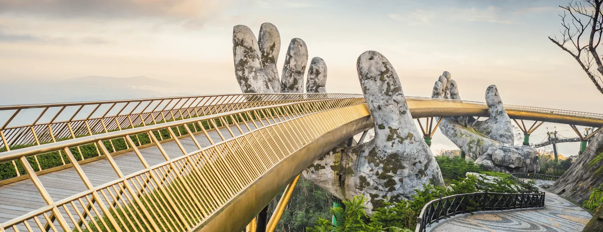 Inspiración en la Mitología Local: Las manos gigantes que sostienen el Golden Bridge están inspiradas en la mitología vietnamita, representando a un ser divino que levanta el puente para conectar la tierra con el cielo.