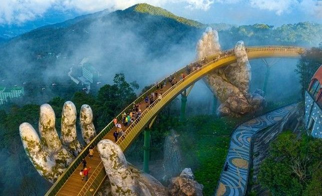 Inaugurado en 2018, este puente peatonal de 150 metros de largo y 5 de ancho, es sostenido por dos gigantescas manos de piedra que parecen emerger de la montaña, es un símbolo de la innovación y la creatividad vietnamita.